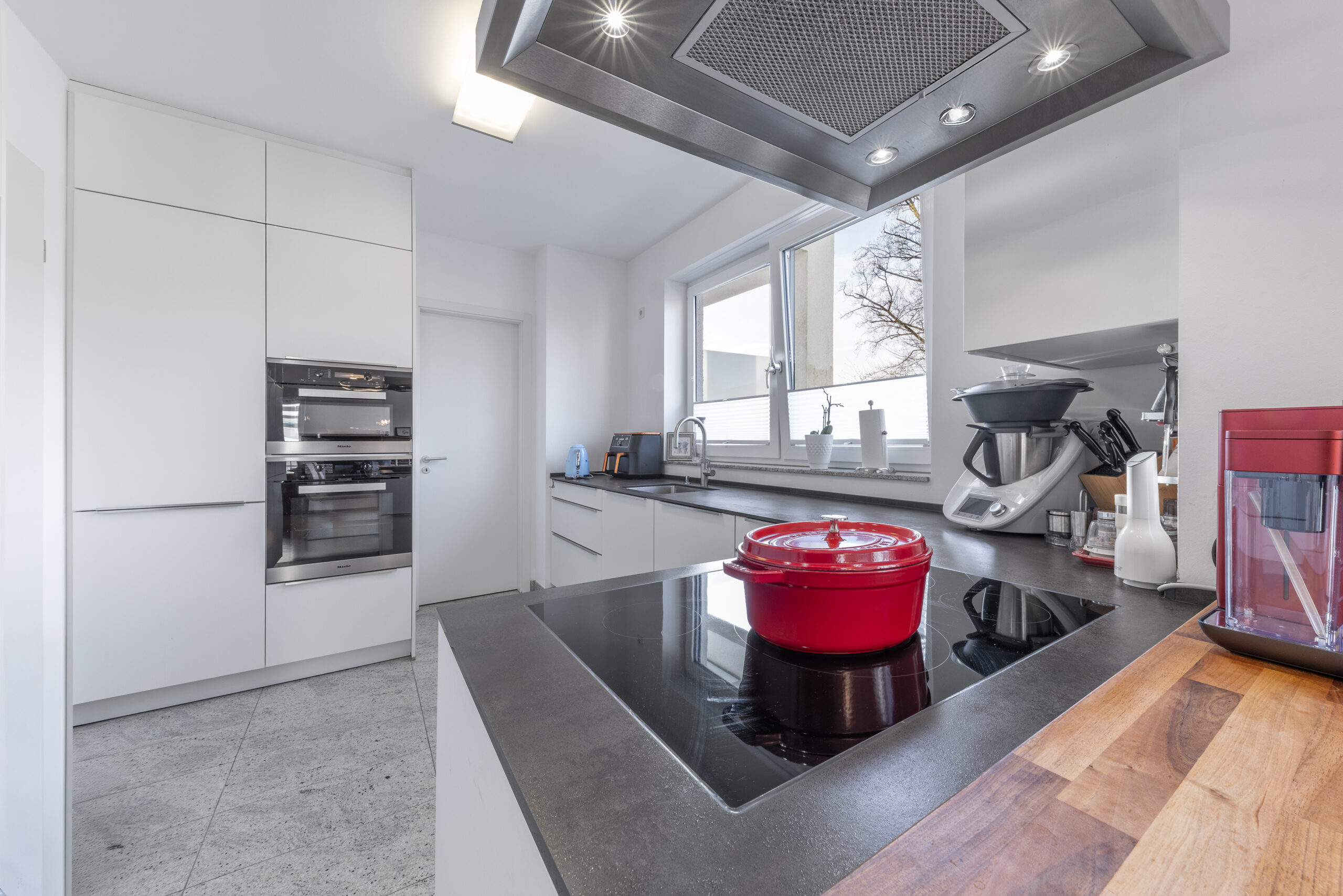 Die moderne Einbauküche mit Gaggenau- und Miele-Geräten ist im Preis inbegriffen. Ein praktischer Hauswirtschaftsraum hinter der Küche verfügt über Anschlüsse für Waschmaschine und Trockner sowie viel Stauraum für Vorräte.
