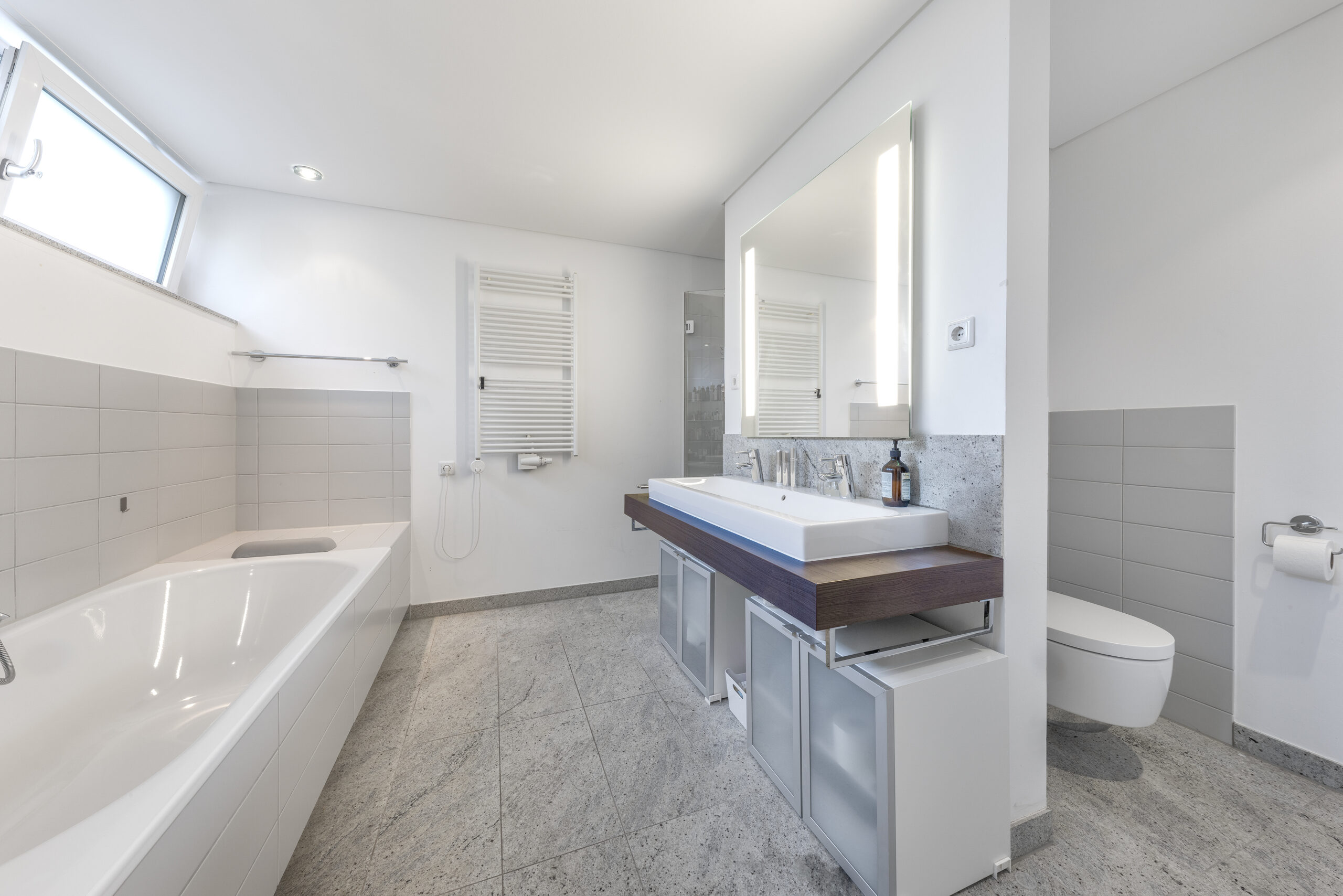 Sie verfügt über einen offenen Koch-, Ess- und Wohnbereich und wird durch die nach Westen ausgerichtete ca. 15 m² große Terrasse und die bodentiefen Fenster in allen Wohnräumen mit Licht durchflutet. Sie wartet mit einem opulenten en-Suite Masterbad für die Hausherrin neben dem großzügigen Schlafzimmer auf. Für Kinder und Gäste steht in deren eigenem Bereich an der Eingangsdiele ein Duschbad mit WC und Waschtisch zur Verfügung.